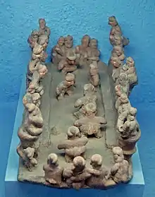 Ballcourts were also used for functions other than, or in addition to, ballgames. Ceramics from western Mexico show ballcourts being used for other sporting endeavours, including what appears to be a wrestling match.[3] It is also known from archaeological excavations that ballcourts were the sites of sumptuous feasts, although whether these were conducted in the context of the ballgame or as another event entirely is not as yet known.[4] The siting of the most prominent ballcourts within the sacred precincts of cities and towns, as well as the votive deposits found buried there, demonstrates that the ballcourts were places of spectacle and ritual.