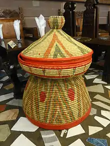 Mesob (Amharic: መሶብ) is a basket used for storing injera, an Ethiopian and Eritrean flatbread.[1] It is widely depicted as a cultural symbol for Ethiopia and Eritrea made from locally grown and partially dyed grass and palm leaves known for strength and durability.[2][3] It was originally made by the Harari people of Ethiopia, then reproduced by other ethnic groups.