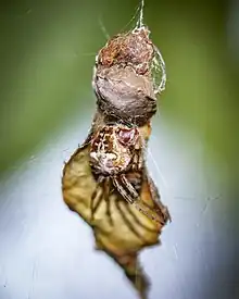 The labyrinth spider is active, with its webs visible, from March through October. During the rainy season, the female mates and lays eggs.[2] The female usually produces 5 or 6 egg sacs with an average of 55 eggs each.[1] She puts her eggs into several silken discs strung together in a bead-like row,[8] and then builds an egg case around the eggs and hangs it in the web near her retreat, where it is camouflaged by other debris in her web. Once the young emerge they are self-sufficient; they leave the mother's nest by ballooning.[2]