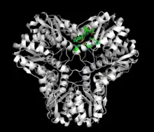 The MGS homohexamer is slightly asymmetrical. All three monomers within the asymmetrical region contain a formate molecule within their respective actives sites. Only one of the monomers within the asymmetrical region is additionally bound to a phosphate.[5]