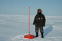 Ice beacon – for tracking the movement of the ice by GPS, as well as containing other sensors for measuring more metocean parameters – and Pablo Clemente-Colón of the U.S. National Ice Center.