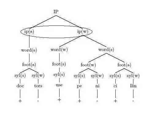 Metrical trees allow us to change the stress pattern for a phrase by switching S and W sister nodes. The tree in (1) represents the metrical structure for the sentence "Doctors use penicillin". when the sentence is providing all new information. This is called broad focus, and might be used in response to a question like "What did you learn at the hospital today?" The same metrical structure would be used when the sentence has narrow focus on the word 'penicillin'; for example, if it was used in response to a question like "What do doctors use to treat that disease?". However, we need a new metrical structure to put narrow focus on the word 'doctors', for example, if the phrase is used in response to the question "Who uses penicillin?" In this case, the S and W nodes at the intermediate phrase (ip) level have to switch, resulting in (2).