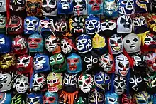 Today, most mask use is related to celebrations and rituals, although modern images and new variations have entered modern popular culture. Traditional masks have been carved with images of figures such as Pedro Infante and Cantinflas .[20] The influence of Halloween from the United States has resulted in the appearance of commercially made masks for the days around Day of the Dead.[21] Masked characters appear in comics, television and movies such as El Chapulín Colorado and Karmatron. However, the most important use of masks in Mexican popular culture are those associated with lucha libre, or professional wrestling.[22] Here, the mask is a symbol of the wrestler's professional identity. They are made of fabric and envelope the head as well as the face, with plastic reinforcement around the eyes and mouth. The designs are unique to the wrestler and they fight to defend this identity. A number of these masks have been passed down from father to son, such as those of El Santo, Blue Demon, Los Hermanos Dinamita, Tinieblas and Dos Caras. In the case of a bout called “lucha de apuestos” the loser loses his mask and his real face is revealed. After this, the mask can never be used again.[23] L