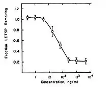 The shape of the fibronectin-decrease curve is more usual, although not quite: the separate parts of the curve are all more or less linear, which is not the case in an S-shaped curve. In this case, a maximum dose can be determined: above concentrations of about 103 ng/mL the effect remains more or less stable. A NOAE-level is visible for concentrations of up to 1 ng/mL of mezerein. The concentration that gives half-maximal effect is approximately 90 ng/mL. The difference with the half-maximal concentration for 2-DG transport is remarkable. Mezerein causes a 46-fold lower effect for fibronectin decrease than for 2-DG stimulation, and apparently only causes this effect at high concentrations. This might also correlate with mezerein being a weak tumor promoter.