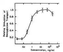 The shape of the 2-DG transport dose-response curve has an optimum at a mezerein concentration of approximately 50 ng/mL. This is atypical, since a dose-response curve usually is S-shaped. The explanation for this behaviour is unknown. Possibly, at high concentrations, mezerein is converted by enzymes that have low affinity for it. That would lower the effective concentration and thus decrease the effects. In this picture, a NOAE-level can be observed between mezerein concentrations of 0 to approximately 0.09 ng/mL. The concentration that gives half-maximal effects is reached for a low concentration of mezerein: about 0.7 ng/mL.