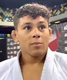 Micael Ferreira Galvão, commonly known as Mica Galvão,[5] (born 8 October 2003) is a submission grappler, Luta Livre and Brazilian jiu-jitsu (BJJ) black belt competitor[lower-alpha 2] from the Brazilian state of Amazonas. A highly decorated athlete competing since childhood, Galvão was promoted to black belt in 2021, at the age of 17,[6] less than three years after reaching blue belt.[7] In 2022 Galvão won the 2022 IBJJF World Jiu-Jitsu Championship before testing positive for a banned substance and receiving a one-year suspension ban.
