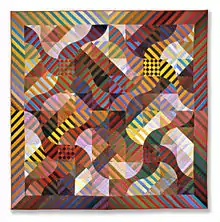 Many consider strip-piecing to be James's signature technique.[33] His pieced panels eventually grew to encompass 36 strips of fabric, each measuring ¾ to 1 inch wide,[34] and were arranged in "luminous"[35] runs of graded color and value. The quilts themselves could include up to 150 different colors[34] resulting in intricate compositions that required dozens of pattern templates.[36] It was for this work, too, that he earned his reputation as a colorist.[37]