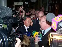 In June 2006, McDowell was involved in a leadership dispute with party leader Mary Harney, over an alleged promise by Harney to step down in favour of him. The dispute appeared to have been resolved with Harney remaining as leader.[45] On 7 September 2006, Mary Harney unexpectedly resigned as party leader and McDowell became the favourite to succeed her in the consequent leadership election. Irish media reported on 10 September 2006 that Michael McDowell would be the sole nominee for party leadership, Liz O'Donnell would become Deputy Leader and that Tom Parlon would become Party President.[46] On 11 September 2006 McDowell was confirmed as party leader[47] and on 13 September 2006, he was appointed Tánaiste.