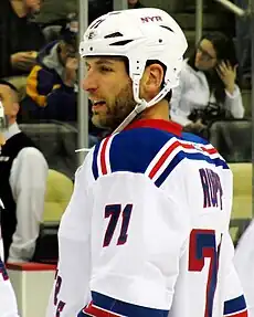 On July 1, 2011, Rupp signed a three-year, $4.5 million contract with the New York Rangers.[7] He scored two goals in the 2012 Winter Classic against the Philadelphia Flyers to help the Rangers prevail 3–2. After Rupp scored his first goal, he saluted the crowd in a similar, yet mocking, fashion to how then-Flyer Jaromír Jágr celebrates a goal; the mocking gesture immediately led to a retaliatory confrontation initiated by Philadelphia forward Scott Hartnell.