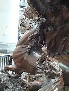 In his pulpits van der Voort achieved the most exuberant expression of the late Baroque in Flemish sculpture. At the end of the 17th century a new design for pulpits had emerged in Flanders. Antwerp sculptor Hendrik Frans Verbruggen was the principal creator behind this new type of naturalist pulpit. In 1696–1699, Verbruggen created a pulpit for the Jesuit church in Leuven, which is now located in the Cathedral of St. Michael and St. Gudula in Brussels. He turned the pulpit into a complex theatrical stage in which at the bottom Adam and Eve are shown driven out of the Earthly Paradise, while the victorious Virgin on top of the pulpit's soundboard crushes the snake slithering from the tree of Good and Evil.[14] In a similar vein van der Voort created a pulpit for the Church of the Abbey of St Bernard near Antwerp in 1713, which is now located in the Antwerp Cathedral. It is decorated with a myriad of plants and animals sculpted in a realistic manner. The supporting column of the pulpit consist of four figures who are representations of the Four Continents.[4] His most exuberant pulpit is located in the St. Rumbold's Cathedral in Mechelen. He created it in 1721 for the abbey of Leliendael. He transformed the structure of a traditional pulpit into a stage for a 'tableau vivant'.[4] The pulpit appears like a free-standing landscape in which a dramatic representation of the conversion of St Norbert takes central place. The saint is shown being thrown from his horse underneath a small mountain. The mountain is brimming with trees, animals and figures that emerge from the background of rough-hewn rocks.[2] The Calvary and the temptation of Adam and Eve are also depicted in the pulpit. The crown of the tree of Good and Evil forms its sounding board. It is no longer possible to distinguish the architectural parts from each other which have become a single whole.[14]