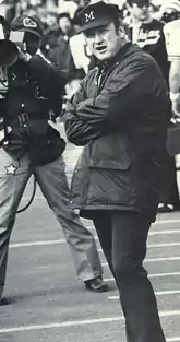 Upon arriving at Michigan, Crisler introduced the winged football helmet, ostensibly to help his players find the receivers down field.[41] Whatever the reasoning, the winged helmet has since become one of the iconic marks of Michigan football.[42] Michigan debuted the winged helmet in a game against Michigan State in 1938.[43] Two years later in 1940, Tom Harmon led the Wolverines to a 71 record on his way to winning the Heisman Trophy.[18][44] Harmon ended the season by scoring three rushing touchdowns, two passing touchdowns, four extra points, intercepting three passes, and punting three times for an average of 50 yards in a game against the Ohio State Buckeyes.[45] The 1943 season included a No. 1 (Notre Dame) vs. No. 2 (Michigan) match-up against Notre Dame, a game the Wolverines lost 35–12.[16] Michigan ended the season at 81, winning Crisler's first Big Ten championship.[15][18]