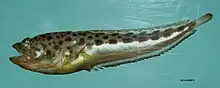A midshipman fish is any species of toadfish belonging to the genus Porichthys (in family Batrachoididae). Historically, there have been two common names. Porichthys refers to the well developed pores on the fish, and this led to the common name "Porous Catfish".[3] The other common name, "Midshipman" is based on the pattern of button-like luminous spots (photophores) which resemble the buttons on the uniforms of young naval officers known as Midshipmen.[4]