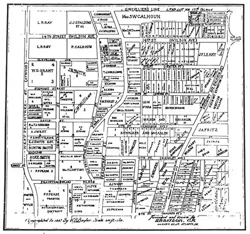 - "Suburbs will not be annexed now: The Rice measure tabled by Council yesterday afternoon", Atlanta Constitution, October 27, 1897. North Atlanta was defined as the area including today's Midtown between Myrtle St. in the Midtown Historic District and Cherry St., now inside the Georgia Tech campus, as far north as 14th St (then called Wilson Ave.); most of what is now the Georgia Tech campus, south of what was then 5th Street; and the area west of Georgia Tech, south of Jefferson St., as far west as Ashby St. (now Lowery Blvd.), including today's English Avenue neighborhood.