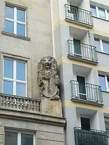 - Stone knights' armorials and lions decorating the Ministry of Army Affairs (Defence) near Nowowiejska St., two lions guarding entrance, after WWII placed in front of the Lubomirski Palace.[14]