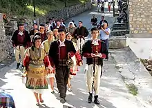 Their ethnonym is unclear.[4] There is a theory that the Mijaks were the first to permanently settle this area; they found mostly Vlachs, who seem to have not been permanently settled; the Mijaks pushed the Vlachs out of the pasture lands, some of whom they assimilated.[5] According to another theory the Mijaks are the remains of an old Slavic tribe that inhabited the area of the Salonica field and was engaged mostly in the cattle breeding.[6] This theory is also confirmed by the legends for the founding of the one of the most significant Mijak settlements as Galičnik.[7]