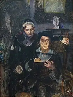 However, Vrubel did not abandon his idea to get paid for his creative work. Thanks to the Papmel family, he received a commission from the industrialist Leopold Koenig. According to the mutual agreement, the subject and technique of the painting would be left at the discretion of the artist and the fee would be 200 rubles. Mikhail also decided to participate in the contest initiated by the Imperial Society for the Encouragement of the Arts and chose the plot of "Hamlet and Ophelia" in the style of Rafael's realism. The self-portrait sketches of Hamlet and watercolors for the general composition which depict the Danish prince as represented by Vrubel have been preserved. However, the work on the painting was complicated with the worsening relationship between the painter and his father.[30] Having failed with the "Hamlet" as well, Vrubel was persuaded by his friends to depict a real life model. For this role, they chose an experienced model Agafya who was put in the same chair that served as decorations for the "Hamlet", while student Vladimir Derviz brought some Florentine velvet, Venetian brocade and other things from the Renaissance period from his parents' house. Vrubel successfully finished the painting "Sitter in the Renaissance Setting" with characteristic for Vrubel "painting embossing" . Under the impression from the "Sitter", Vrubel returned to "Hamlet". This time he painted with oil on a canvas with Serov as a model.[31]