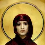 The fresco "Descent of Holy Spirit on the Apostles" that Vrubel painted on the choir of the St. Cyril's church bridged both features of Byzantine art and his own portrait pursuits. The fresco reflected most of the Vrubel's characteristic features and depicted twelve Apostles that are situated in a semicircle at the box vault of the choirs. The standing figure of Mary is located in the center of the composition. The background is coloured in blue while the golden rays are coming up to the apostles from the circle featuring the Holy Spirit.[33] The model for Mary's figure was a paramedic M. Ershova – a frequent guest in the Prakhov's house and the future wife of one of the painters participating in the restoration process. To Mary's left stands the apostle that was painted from protoiereus Petr (Lebedintsev) who at that time taught at the Richelieu lyceum. To Mary's right stands the second apostle for whom the Kiev archaeologist Viktor Goshkevich was modelling. The third from the right was the head of the Kirillovsky parish Peter Orlovsky who originally discovered the remains of old paintings and interested the Imperial Russian Archaeological Society in their reconstruction. The fourth apostle, with his hands folded in prayer, was Prakhov. Besides the "Descent", Vrubel painted "The entry into Jerusalem" and "The Angels’Lamentation".[37] The "Descent" was painted directly on the wall, without any cardboard and even any preliminary sketches – only certain details were previously specified on small sheets of paper. Remarkably, the painting depicts Apostles in a semicircle with their limbs connecting to the Holy Spirit emblem. This painting style was of Byzantine origin and was inspired by a hammered winged altarpiece from one of the Tiflis monasteries.[38]