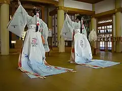 When a miko serves a Shinto ritual or performs a shrine maiden dance or kagura, she wears a chihaya over the top.[13]
