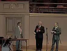 Milan Štěch (center) hands in the Senate medal to Claude Cohen-Tannoudji (left) in Rudolfinum, Prague.