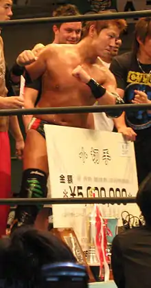 After returning to Japan full time in 2007, he began working for New Japan Pro-Wrestling (NJPW), as a part of the R.I.S.E. faction. He received his first title opportunity in New Japan on November 6, 2006, unsuccessfully challenging Tiger Mask IV for the NWA World Junior Heavyweight Championship.[8] He achieved his greatest success in both New Japan and as a professional wrestler in 2007 when he won New Japan Pro-Wrestling's Best of the Super Juniors tournament, defeating Wataru Inoue in the final.[9] In August, he took part in the G1 Climax, finishing with 2 wins and 4 points. In November, he teamed with Hirooki Goto as R.I.S.E in the G1 Tag League, making it to the semi-finals where they were eliminated by Hiroshi Tanahashi and Koji Kanemoto.[10]