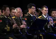 The Director of the PLA Band, Colonel Zhang Haifeng conducting members of the PLA Band and the Band of the WMD.