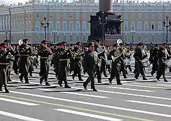 Its history dates back to 1882, when Emperor Alexander III signed a decree on the establishment of the Court Brass Band. On October 1, 1917, an order was issued to disband the band due to the Russian Revolution. It was recreated in February 1918 only to be disbanded again three years later in 1921. The Petrograd city government attempted to recreate another band for the city in 1926, which only be active for 4 years until November 1, 1930, when a garrison band was created with Abram Genshaft becoming its first leader. During the Siege of Leningrad, the band took part in the performance of the Dmitri Shostakovich's Symphony No. 7 in 1942. After the war, the band was renamed to the Band of the Leningrad Military District in 1946. The band in its current form has been active since September 2010, when the Leningrad and Moscow military districts, and the Northern and Baltic fleets were merged.[3][4][5]