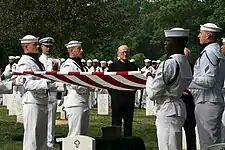 The flag of the United States draped over the casket is meticulously folded thirteen times by a total of six honor guards, three on each side of the casket. When the flag is completely folded, the stars point upwards, which remind Americans of their national motto, In God We Trust.[5][6][7] After the flag is completely folded and tucked in, it takes on the appearance of a tricorne hat, reminding Americans of the soldiers who served under General George Washington, and the sailors and Marines who served under Captain John Paul Jones, who were followed by their comrades and shipmates in the United States Armed Forces.[5][6][7]