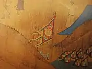 The sky was clear, there was no wind, and the heat of the sun was strong. The large sea-going ships [of the Chinese] were unable to move. The men of Jin shot incendiary arrows at the mat-sails [of the Chinese ships] which were set on fire. [Han] Shizhong had originally prepared his ships for fighting on the water and on land. His troops were in complete armor and the horses wore iron face-masks and leather armor. The ships carrying men and horses, food and supplies, were unable to move without wind. When the flames arose, the men shouted in confusion and the horses neighed in fright.[67]