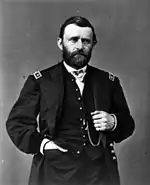 When the war began, the American standing army or "Regular army" consisted of only 1080 commissioned officers and 15,000 enlisted men.[4] Although 142 regular officers became Union generals during the war, most remained "frozen" in their regular units. That stated, most of the major Union wartime commanders had previous regular army experience.[5] Over the course of the war, the Commanding General of the United States Army was, in order of service, Winfield Scott, George B. McClellan, Henry Halleck, and finally, Ulysses S. Grant.