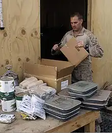 Vegetarianism and veganism are usually considered for military foods, though their options are often few compared to non-vegetarian options. For example, as of September 2022, the U.S. military's MRE only had four vegetarian menus and no vegan menus, though the 2023 National Defense Authorization Act, passed in July 2022, was noted to have included an amendment requiring the Defense Logistics Agency to investigate the possibility of creating MREs with plant-based foods.[10] In some militaries, such as the Armed Forces of Ukraine, all rations contain meat or animal products, with vegetarian and vegan rations only provided to soldiers by volunteers and not the military proper.[11] However, in others, such as the Israel Defense Forces—in which approximately 1 in 18 soldiers identifies as vegetarian—plant-based and meat-free rations have been issued since 2017.[12]