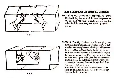 A second captured NSG2 was brought to the American army by the British, improved on and issued as the SCR-578-A "Gibson Girl" survival radio in 1942. It was carried by United States Army Air Forces aircraft and intended for use in life rafts. It included the M-277-A collapsible box kite to raise the antenna, which was also included in some of the later SCR-578-B sets. It was similar to the kite included with the NSG2 but did not include the wings. The 17 x 17 x 36 inch frame of the M-277-A was made up of 4 aluminum rods, each rod end was attached at the ends by a hinge to 4 shorter rods, and each of these met in the middle, attached by a locking mechanism, so that the whole thing could be opened up like an umbrella. The yellow cloth was treated with water repellent and part of one section filled with kapok to add buoyancy if it fell into the water.[14] It was designed to be simple to assemble, and could fly in winds from 7 to 40 miles per hour. It packed into a cardboard tube, on which were also printed the assembly instructions.