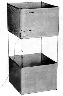 The first kite used by the United States Army Signal Corps specifically for raising an antenna was designed and built by Sergeant Thomas I. King, Signal Corps Company A, while stationed at Fort Leavenworth, Kansas, in 1905. The “King” kite was large, 7 feet high and 5 feet wide, made of 15 yards of white Japanese silk on a bamboo frame, and weighed less than 2 pounds.[2] Similar to Silas J. Conyne's kite of 1902,[3] it had a diamond shape with a squared-off top and bottom, keel, and large opening in the center to give it some of the stability of a box kite. It was used either singly or in trains of 2 to 4 kites or, on less windy days, in conjunction with a balloon to provide extra lift.