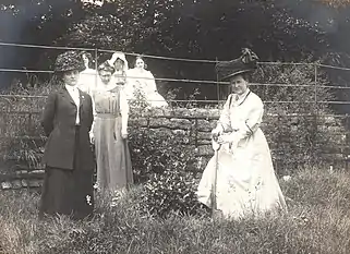 At front: Dr Mary Morris, Mary Blathwayt and Fawcett at Eagle House, Bath, 1910. Annie and Kitty Kenney and Adela Pankhurst in the background.