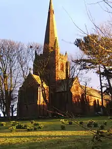Millom's original parish church is Holy Trinity, a grade I listed building dating to the 12th century.[28] In 1877 the growth of the town required the building of another church and architects Paley and Austin were commissioned to build St George's, a Grade II Listed building.[29] There are also Roman Catholic, Baptist and Methodist churches and a community church. Jehovah's Witnesses also have a Kingdom Hall in the town.
