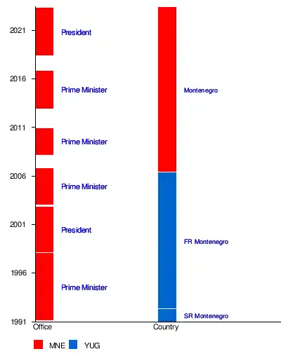 Milo Đukanović (Cyrillic: Мило Ђукановић, pronounced [mǐːlo dʑǔkanoʋitɕ] ⓘ; born 15 February 1962) is a Montenegrin politician who served as the President of Montenegro from 2018 to 2023, previously serving in the role from 1998 to 2002. He also served as the Prime Minister of Montenegro (1991–1998, 2003–2006, 2008–2010 and 2012–2016) and was the long-term president of the Democratic Party of Socialists of Montenegro, originally the Montenegrin branch of the League of Communists of Yugoslavia, which governed Montenegro alone or in a coalition from the introduction of multi-party politics in the early 1990s until its defeat in the 2020 parliamentary election. He is the longest-ruling contemporary politician in Europe, having held key positions in the country for over 33 years. However, he was defeated by the 36-year-old centrist former economy minister, Jakov Milatović, after the presidential run-off held on 2 April 2023.