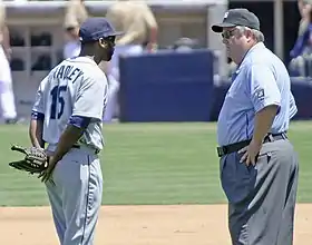 Bradley started his tenure with the Padres on the 15-day DL, but came off it on July 7; in July, he batted .364 with four home runs and 12 RBI in 18 games.[34] On September 23, 2007, however, he tore his right ACL while being restrained by Padres manager Bud Black during an altercation with first base umpire Mike Winters.[49] Home plate umpire Brian Runge reportedly told Bradley that Winters said that he had tossed his bat in Runge's direction in a previous at-bat.[49] After Bradley reached first base, he questioned Winters about the alleged bat throwing and subsequent communication with Runge. According to Bradley and Padres first base coach Bobby Meacham, Winters addressed Bradley with a barrage of profanity.[49] Bradley then moved towards Winters. While restrained by Black, Bradley fell to the ground and injured himself. He missed the final week of the regular season in 2007, during which the Padres lost to the Colorado Rockies in a one game playoff for the National League wild card on October 1.[50]
