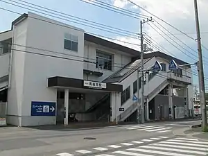The station consists of two ground-level opposing side platforms serving two tracks, with an elevated station building located above.