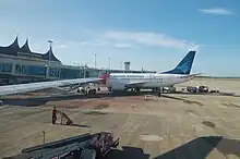 The airport is designed to serve only 2.87 million passengers per year, but it served 4.13 million passengers in 2018. Due to overcrowding, the airport authority pledged to expand the airport capacity from current 3.84 million passengers movement to 5.7 million passengers starting from 2018.[6][7] The airport authority also focuses on renovating the airport's preexisting facilities. Some facilities that have been refurbished are the toilet and the arrival gates.[8] After finishing the first phase of development, the passenger terminal building is expanded to 36,789 square meters so it can accommodate 3.7 million passengers per year.