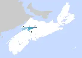 The Minas Basin forms the eastern part of the Bay of Fundy which splits at Cape Chignecto and is delineated by the massive basalt headlands of Cape Split and Cape d'Or. The Minas Basin is divided into four sections: (1) the Minas Channel, from the shortest line between Cape Chignecto and the Annapolis Valley Shore to Minas Passage, between Parrsboro and Cape Blomidon; (2) Central Minas Basin, from Minas Passage to the mouth of Cobequid Bay, the shortest line point between Economy and the Noel Shore; (3) Cobequid Bay which extends to the mouth of the Salmon River; and (4) the Southern Bight, from the mouth of the Avon River to the shortest line between Cape Blomidon and the Noel Shore.[2]