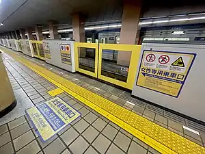 On Platform 1 for Nagoyakō Station, train door 13 is closest to the elevator, door 12 is closest to the escalator, and doors 5 and 12 are closest to the stairs. On the opposite platform, Platform 2 for Kanayama Station, train door 14 is closest to the elevator and doors 7 and 14 are closest to the stairs.[2][3]