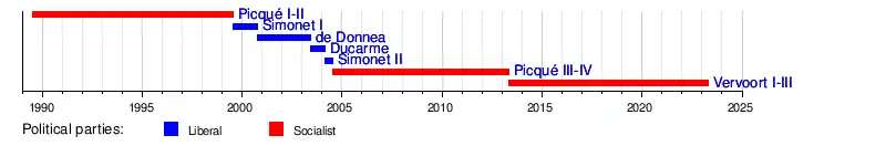 7 May 2013 Incumbent 10 years, 173 days PS Vervoort I Open VLD, CD&V, Groen PS, Ecolo, cdH