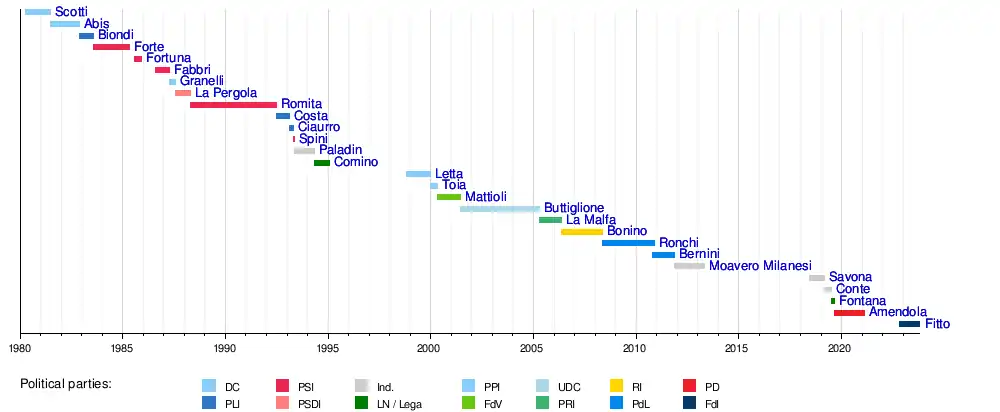 The current Minister for European Affairs is Raffaele Fitto, of the Brothers of Italy party, who is serving since 22 October 2022.
