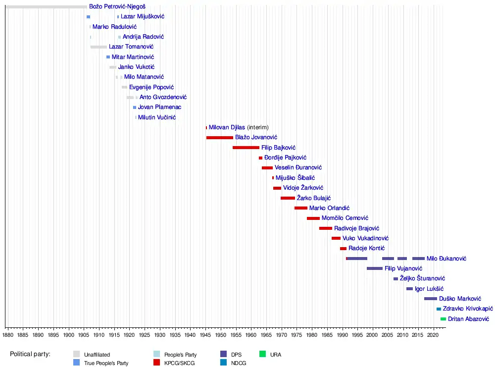 2002 | January 8, 2003 | June 3, 2006 | 3 years, 133 days | Democratic Party of Socialists | Filip Vujanović![]() (2003–2018) | |