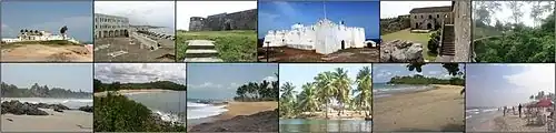 Tourist arrivals to Ghana include South Americans, Asians, Europeans.[7] Ghana's all year round tropical warm climate along with its many varieties of wildlife; exotic waterfalls such as Kintampo Waterfalls and the largest waterfall in West Africa, Tagbo Falls; Ghana's coastal palm-lined sandy beaches; caves; mountains, rivers; meteorite impact crater and reservoirs and lakes such as Lake Bosumtwi or Bosumtwi meteorite crater and the largest lake in the world by surface area, Lake Volta; dozens of castles and forts; UNESCO World Heritage Sites; nature reserves and national parks are major tourist destinations in Ghana.[7]
