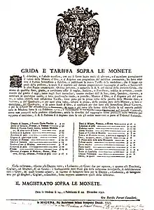 The last coinage in Mirandola took place under the short-lived reign of the last duke Francesco Maria II Pico, or rather by the imperial military garrison during the siege of the French at Mirandola in 1704-1705 during the War of the Spanish Succession. In October 1704, in fact, the Caesarean commander Dominik von Königsegg-Rothenfels had to provide for the minting of new coins, as he had to meet the costs of the siege; however, not being able to manufacture new coinage, the Alemanni decided to reuse the old coinage with the effigy of Alexander II Pico (who had died in 1691) and inserting the year 1704.[10] This currency was not accepted by the population, so much so that the imperial authority had to issue a decree to enforce the use and acceptance of these coins: With the fall of the Pico family, accused of felony by the Emperor and exiled for having sided with the French, the mint of Mirandola definitively ended its history; however, the coins of Mirandola continued to be mentioned in proclamations and tariffs since, in an economy that was very poor at the time, the circulating currency was always the same.[10] In a Grida e tariffa sopra le monete issued in Modena at the end of December 1731, the "Pezzo della Lira della Mirandola" is still mentioned.