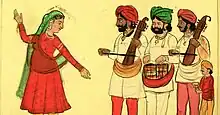 The Mirasi of Punjab were under the patronage of the Sikh Empire during the reign of Maharaja Ranjit Singh.[3] They acted as hereditary bards, genealogists, and musicians. They performed at folk, qawwali, gurbani, melas at Sufi spaces in that period. Traditional lore, such as Heer Ranjha in the Bhairavi raga, were performed musically. Ragadari (raga) was evoked and employed by the Punjabi Mirasi, even if they lacked the precise technical knowledge of it. Female mirasi performers were known as "mirasans". The performers at the shrine of Mian Bibi were traditionally Mirasi women, whom used "obscure" ragas. The Mirasi exercised complex Indic musical modes and metres, such as "complex meend, gamak and quicksilver khatkas". Since they had no elite education in Indic musical tradition, they used colloquial language to refer to these complex metres and modes they made use of, such as by referring it as "machhi mar katan" ('bird swooping down on fish').[3]
