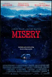 Misery is a 1990 American psychological thriller film directed by Rob Reiner, based on Stephen King's 1987 novel of the same name, starring James Caan, Kathy Bates, Lauren Bacall, Richard Farnsworth, and Frances Sternhagen. The plot centers around an obsessive fan who holds an author captive and forces him to rewrite the finale to his book series.