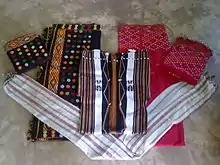 The traditional craft of weaving is a very important aspect of Mising culture.[9] It is an exclusive preserve of the Mising woman, who starts her training in the craft even before she reaches her teens. All clothes the Mising wear are woven by the women of the household. Men wear cotton jackets (Mibu Galuk), light cotton towels, endi shawls, thick loin cloths, and, occasionally, even shirtings. Women wear a variety of clothes, depending on the occasion. The ege is a lower garment, comprising a sheet of cotton. Above this may be draped a ri:bi or Gaseng, both cotton sheets used to cover the ege and a blouse. However, while the ri:bi has narrow stripes, the gaseng has broad stripes of contrastive colours. Instead may be worn a Gero: a sheet, usually off-white, wrapped round the waist to cover the lower part of the body, or round the chest to cover the body down to the knees or so, or a seleng gasor: a light cotton sheet, worn occasionally instead of a ri:bi or a gaseng. Other forms of clothing include the riya, a long, comparatively narrow, sheet, wrapped, a bit tightly, round the chest. Married women will wear the segrek, a loose piece of cloth, wrapped round the waist to cover the ege down to the knees. Other accessories include a po:tub: a scarf used to protect the head, and nisek: a piece of cloth to carry a baby with.