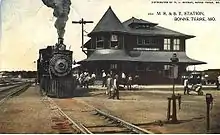 The Missouri Pacific acquired the M.R. & B.T. in 1929 and merged it with the Missouri-Illinois Railroad, which operated it as an independent subsidiary until 1945.[6] In 1938 a gasoline passenger train operated and made two round trips per day.[2] The Missouri Pacific Railway subsequently acquired 51% of the Missouri–Illinois Railroad, with which it merged in 1978.