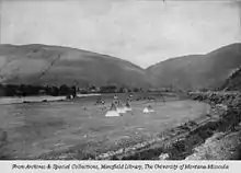 The Missoula area began seeing settlement by people of European descent in 1858 including William T. Hamilton, who set up a trading post along the Rattlesnake Creek, Captain Richard Grant, who settled near Grant Creek, and David Pattee, who settled near Pattee Canyon.[9] Missoula was founded in 1860 as Hellgate Trading Post while still part of Washington Territory. By 1866, the settlement had moved east, 5 miles (8 km) upstream, and had been renamed Missoula Mills, later shortened to Missoula.[10] The mills provided supplies to western settlers traveling along the Mullan Road. The establishment of Fort Missoula in 1877 to protect settlers further stabilized the economy. The arrival of the Northern Pacific Railway in 1883 brought rapid growth and the maturation of the local lumber industry. In 1893, the Montana Legislature chose Missoula as the site for the state's first university. Along with the U.S. Forest Service headquarters founded in 1908, lumber and the university remained the basis of the local economy for the next 100 years.[11]